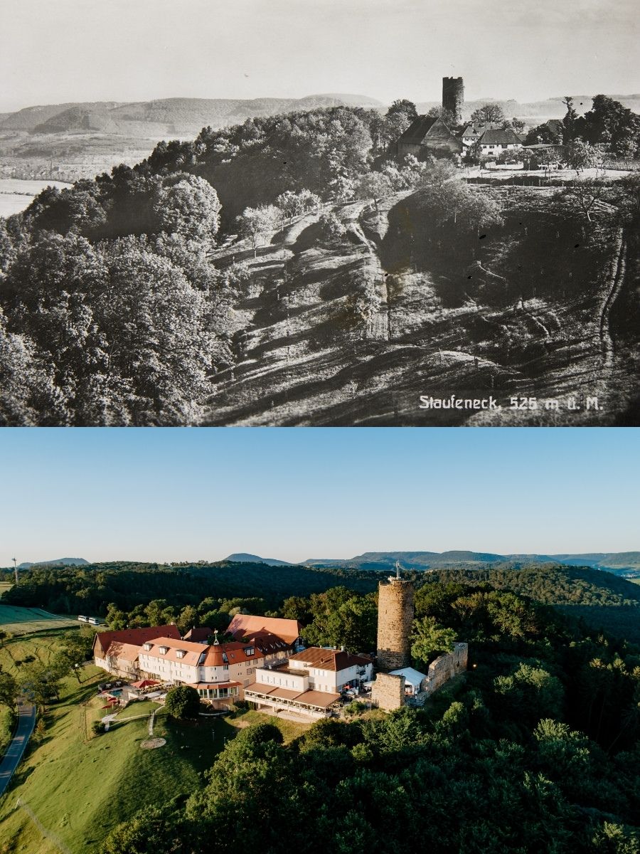 Wiedergeburt | Erst 1926 wird der 27 Meter hohe Burgfried wieder zugänglich gemacht. Mutig beginnt Hildegard Wörner 1927 mit der Bewirtschaftung im Westteil der Ruine. Ihre Tochter Lore und deren Ehemann Erich Straubinger übernehmen 1973 die Gastwirtschaft und erwecken die Anlage zu neuem Leben. Mit großem Engagement und unternehmerischem Geschick etablieren sie ein gehobenes Restaurant mit Bankettsaal.
