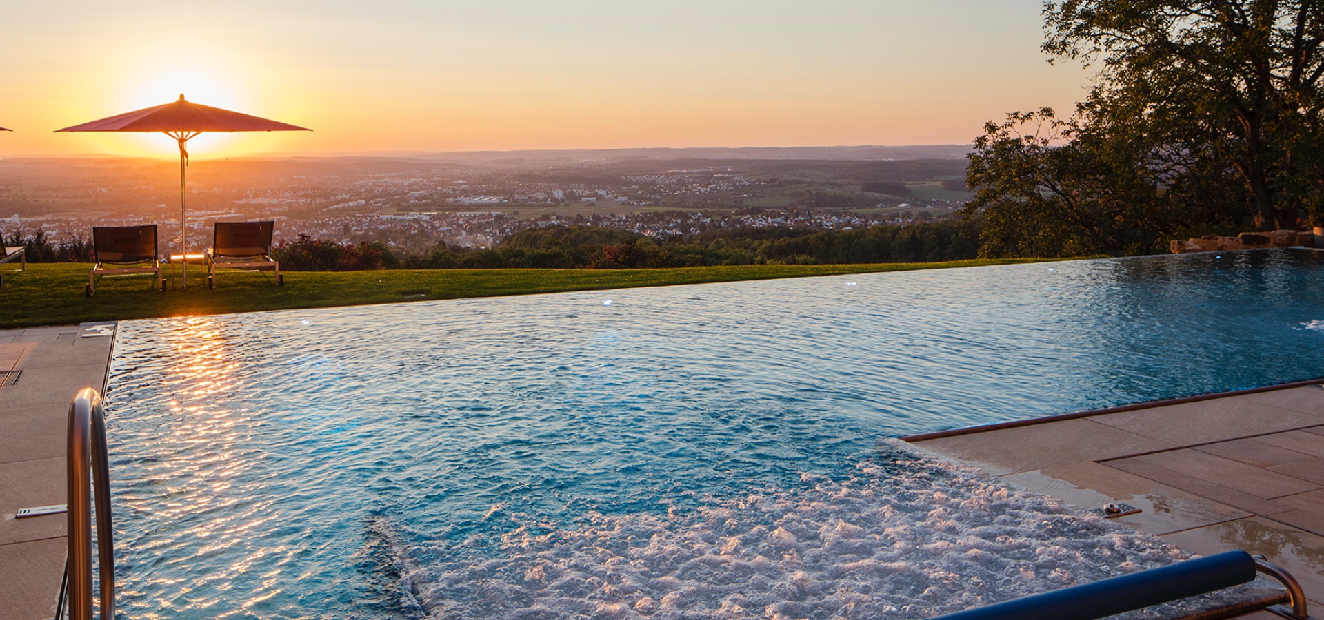Wenn sich die Sonne am Horizont verabschiedet und das Lichtermeer zu Ihren Füßen erwacht, wird es auch im Panorama-Außenpool des Wellnesshotels in Stuttgart Umgebung ganz still. Dann, hoch oben auf dem grünen Hügel, ist es so einfach, den Kopf freizumachen und sich gänzlich der Entspannung hinzugeben. Genießen Sie diese ruhigen Momente im Spa-Bereich Ihres Hotels in Göppingen. Ein Wellnesshotel wie dieses ist einfach überragend.